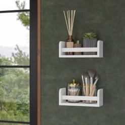 Create a designated bookshelf area for your little ones to keep their favorite books with these wall mounted bookshelves. At just 10” wide and 4” tall, these small floating wall shelves are perfect for organizing baby and toddler books in the nursery, displaying nursery décor, setting mail in the entryway, or creating an adorable kids bookshelf wall in the playroom. Looking for a small office wall shelf? Pair this white wall bookshelf with one or two more shelves in a staggered or stacked arrangement to set stationery, display small picture frames and other decorative items in your workspace. Not only is this kids wall shelf great for playrooms, entryways and offices, but it makes an ideal small bathroom wall shelf and the perfect solution for adding shelf space and décor to small bathrooms. Display small candles, succulents, reed diffusers and more without worrying that anything will fall off the edge, thanks to the horizontal book bar in the front. Includes instructions for easy assembly.