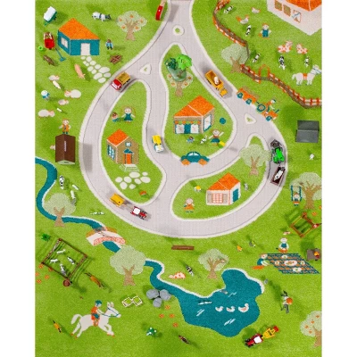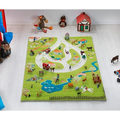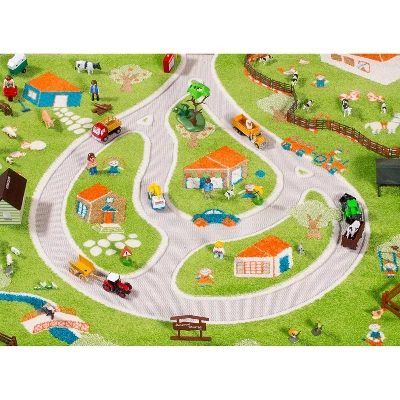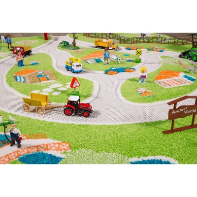 - Farm carpet utilizes the same unique properties of mixed textures and raised, divided sections – mapped out winding roadways sit flat and are perfect for driving toy cars while plush raised sections mimic greenery and grass. Kids can incorporate their farm animals, tractors and create their dream ranch!