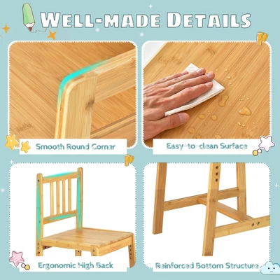 - Natural Bamboo Material: The whole table and chair set is crafted from natural and odorless bamboo material which has high deformation resistance and durability. The varnished surface is smooth and easy to clean with damp cloth. Moreover, the bottom thickened cross bars are designed to enhance the overall stability.