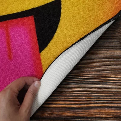 Art does not have to be displayed exclusively on walls. Let your floors show off some flair too! Add happiness to your home decor with this beautiful emoji area rug. its yellow color will fit in with any decor theme, and make it as a unique gift that’s great for any occasion. Machine tufted with durable synthetic fibers, it has a soft and comfortable texture, does not shed, and is easy to clean. Its low .25 pile makes it ideal for high traffic areas of your home and will not obstruct doorways. A slip resistant latex backing keeps the area rug safely in place. Due to the hand finished nature of this product, please allow for slight variations in size and/or shape. Whether you display it in your bedroom, play room, or nursery, itll bring your home decor to the next level.