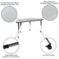 Are you a teacher who hates the look of a stale environment? Change the look in your classroom without breaking a sweat with mobile activity tables you can move yourself after school or have your students rearrange at will for effective group collaborations. Modern wave activity tables are designed to nest together to grow with the size of your groups. Students feel more encouraged to work in groups with furnishings designed for collaboration. Built to last through many class turnovers the thermal fused laminate top is scratch, stain and warp resistant. An attractive black powder coated finish protects the upper legs from scratches and height adjustable chrome lower legs give you the flexibility to raise or lower the table a full 8″ in 1″ increments. Locking casters allow you to lock each caster as needed to move or lock in place. Mix various shaped nesting activity tables around the classroom for better interaction between students as well as helping to define workspaces. This table accommodates 6 16″ or 18″ seat ergonomic shell stack chairs. For the ultimate classroom setup add our soft seating collaborative circle and moon shaped ottomans to add color and safety. Collaboration doesn’t happen only in the classroom, add this office group table in your conference room or collaborative space for team members to gather around. Additional Features: Locking Casters can be locked while in use, Recommended Grade Level: 1st Grade – Adult, Recommended Seating Capacity: 4 adults or children, Recommended Usage: home school, classroom, playroom, arts and crafts, office, meeting spaces.